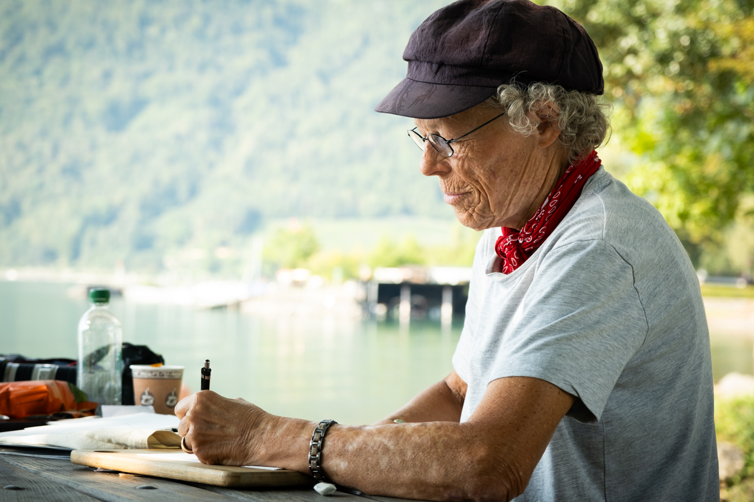 Op de camping aan de Walensee zat iedere dag, de hele dag, een oudere vrouw aan de picknicktafel bij het water. Ze tekende, fotografeerde en zwom. Ze zwom veel, viel ons op. Roline vroeg haar hoe het ging toen ze langs ons liep. “Zo zo, zei ze”. Ze vertelde dat ze in de buurt woonde en dat zwemmen een levensbehoefte voor haar was. Vroeger had ze het meer diverse keren in de lengte overgezwommen. Vijftien kilometer lang. Een vrouw met een verhaal, dacht ik meteen. “Ik wil wel een portret van haar maken”, zei ik tegen Roline toen de vrouw weer doorliep. Makkelijker gezegd dan gedaan. Zo makkelijk ben ik daar niet in. Maar ja, ik had het nu gezegd.