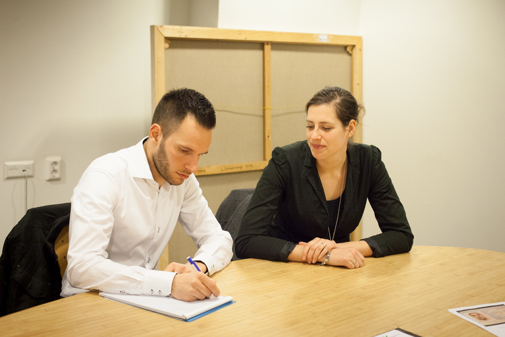 We worden uitgenodigd in een kamer zonder ramen. Er hangt een vrolijk schilderij aan de ene muur, om er nog iets van te maken en er staat een enorm schilderij tegen de andere muur, met de rug naar de kamer, om weer wat afbreuk aan de sfeer te doen.