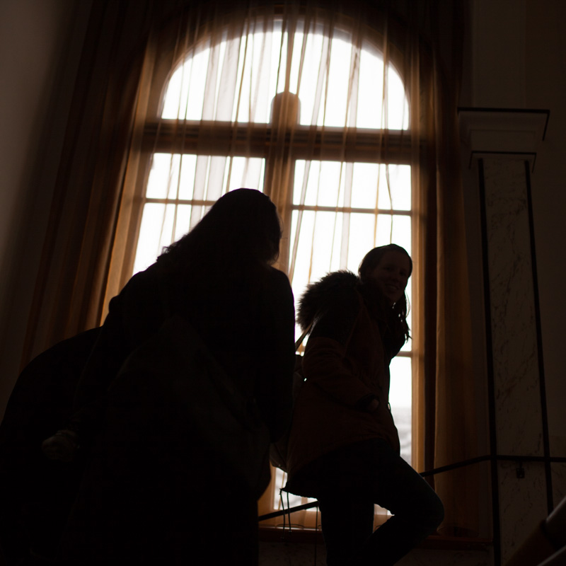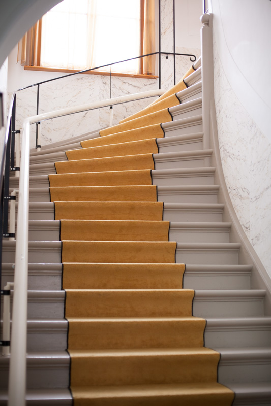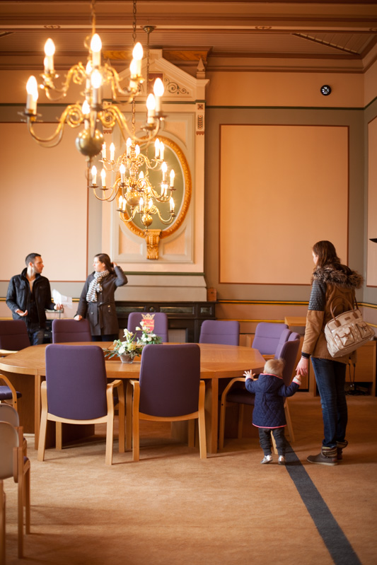 Het is een mooi gebouw. Niet zo groot, wel knus eigenlijk. Ik zie al plekjes waar mooi licht valt. Daarom ben ik mee. Even rond kijken zodat het bij de trouwerij geen verassing is als ik het gemeentehuis binnenloop. ‘Als ze nou even bij de deur blijven staan en daarna langzaam de trap oplopen en als…’, mijn gedachten gaan meteen aan de gang om fotomomenten op te slaan. Ik heb er nu al zin in om de dame en heer straks in hun mooie kledij te fotograferen.